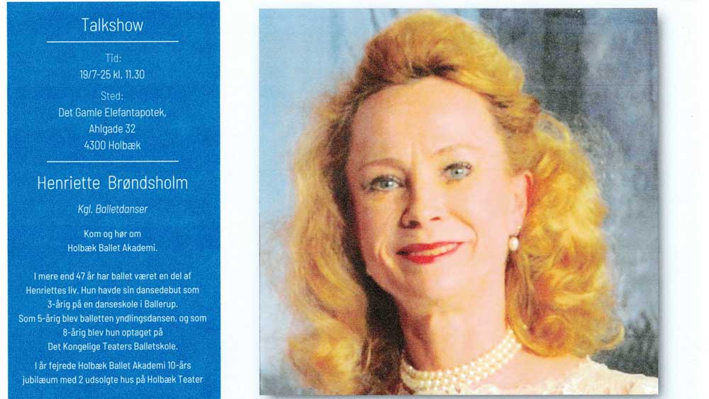 Henriette Brøndsholm, kgl. balletdanser, Holbæk Balletakademi. Hun har arbejdet med ballet på et professionelt plan i mere end 47 år. Der følger mere om dette arrangement senere, men Henriette Brøndsholm fortæller:
